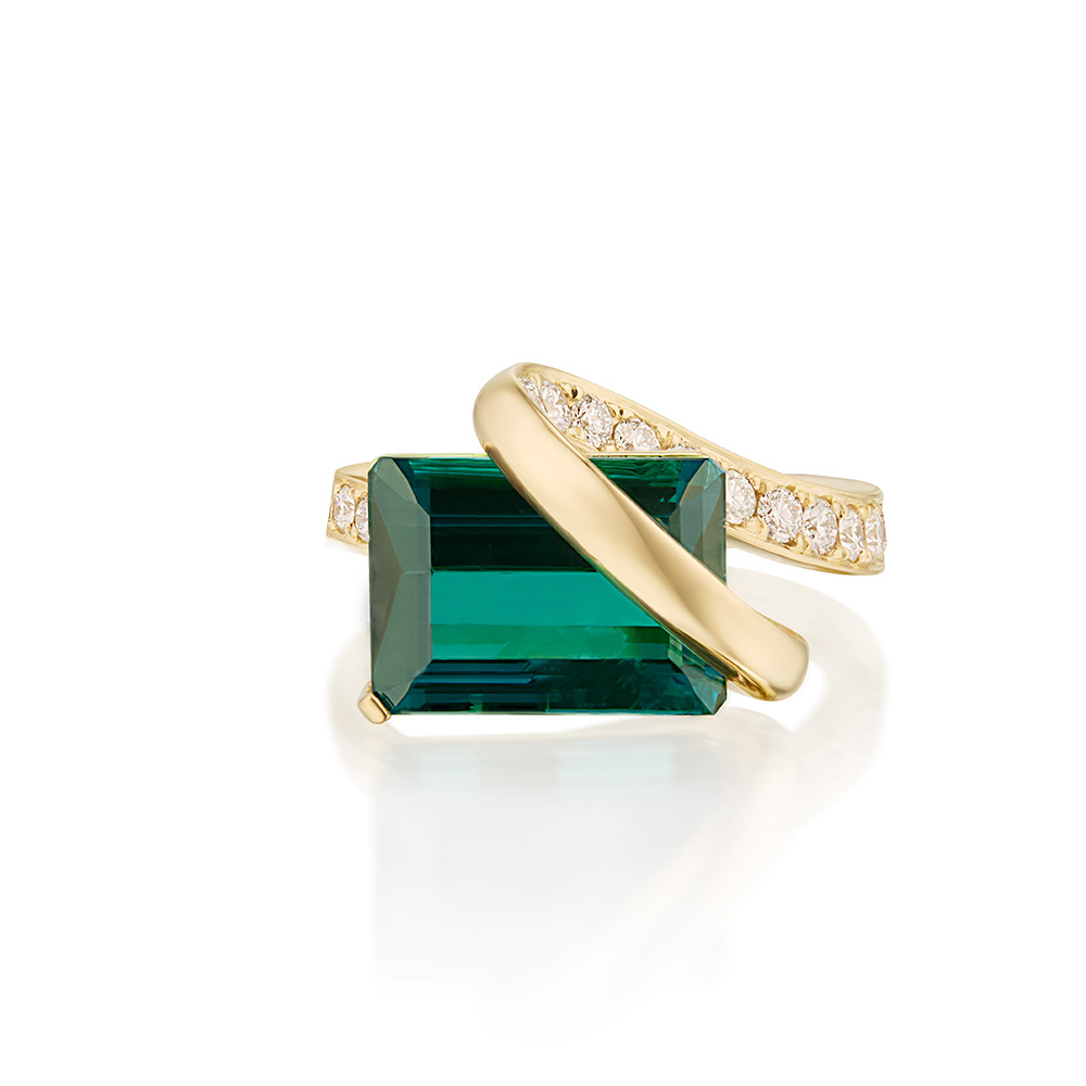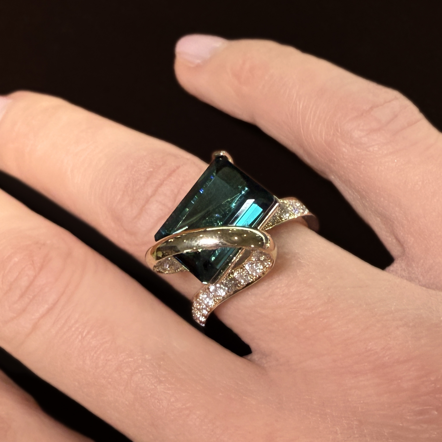 18K Yellow Gold Ring with a Brazilian Tourmaline Stone and Pavé Diamonds