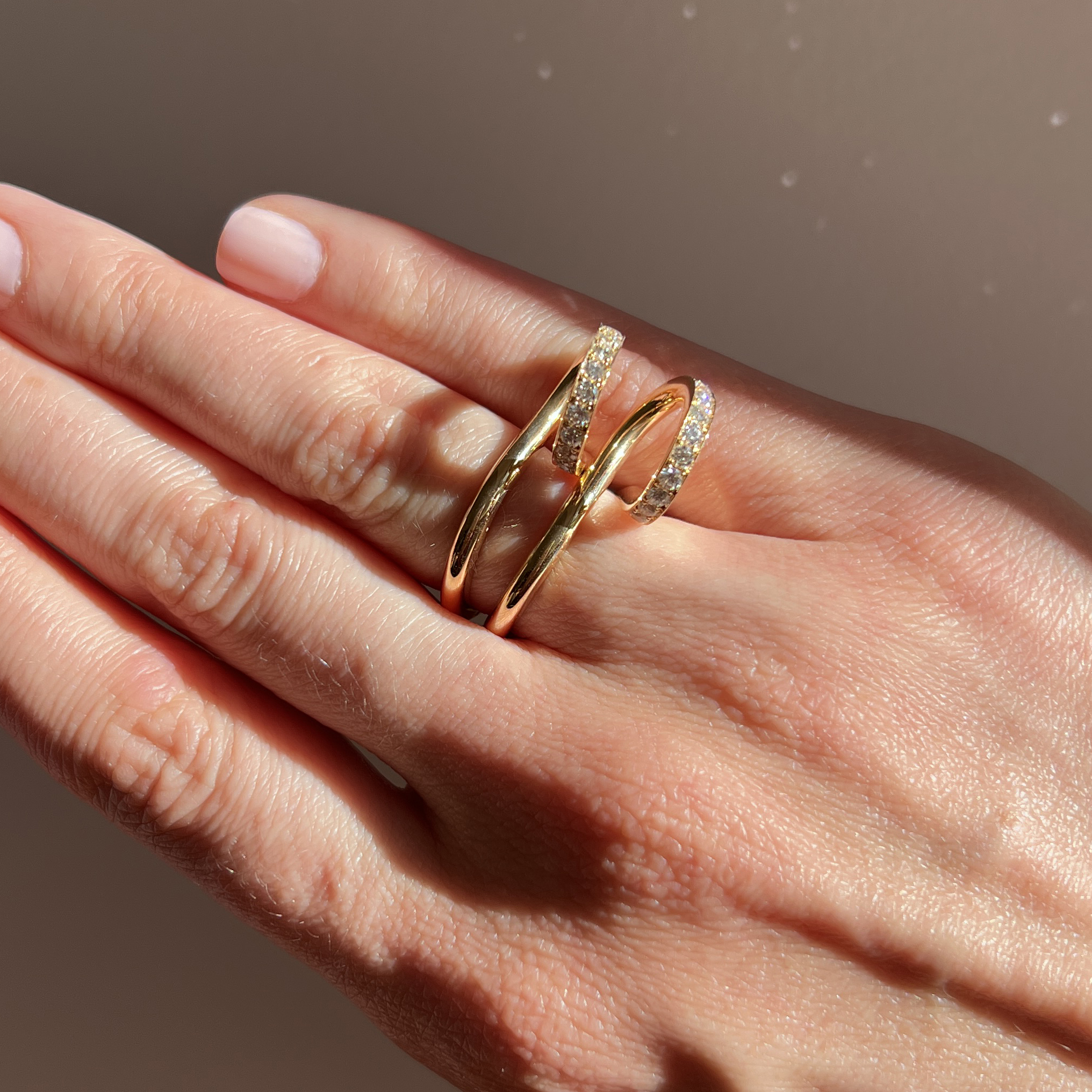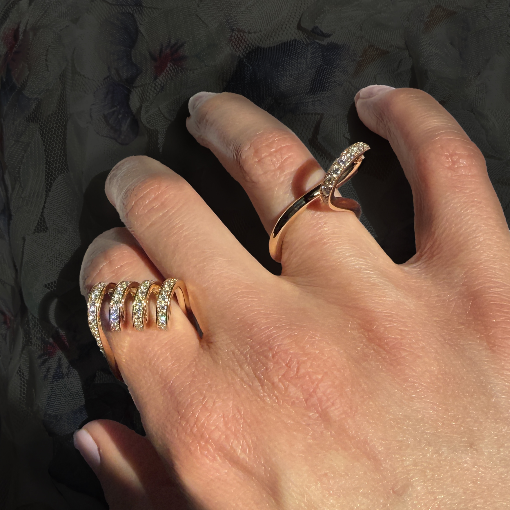 The Renisis Curl Collection embodies the duality of strength and softness—a sculptural dialogue between power and grace. Rooted in Sardwell’s love of the helix, the curve, the infinity symbol, combined with the renitor concept of strength, each piece spirals with symbolic familiarity, tracing forms that feel both organic and eternal.