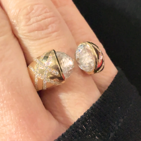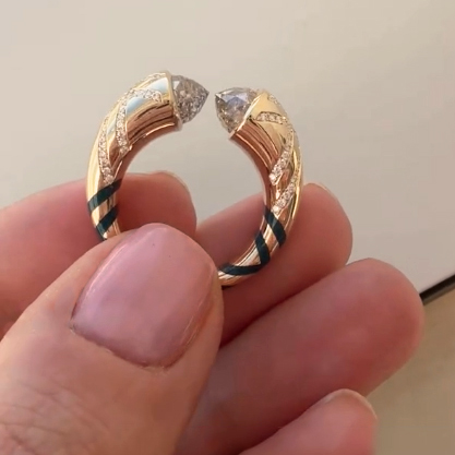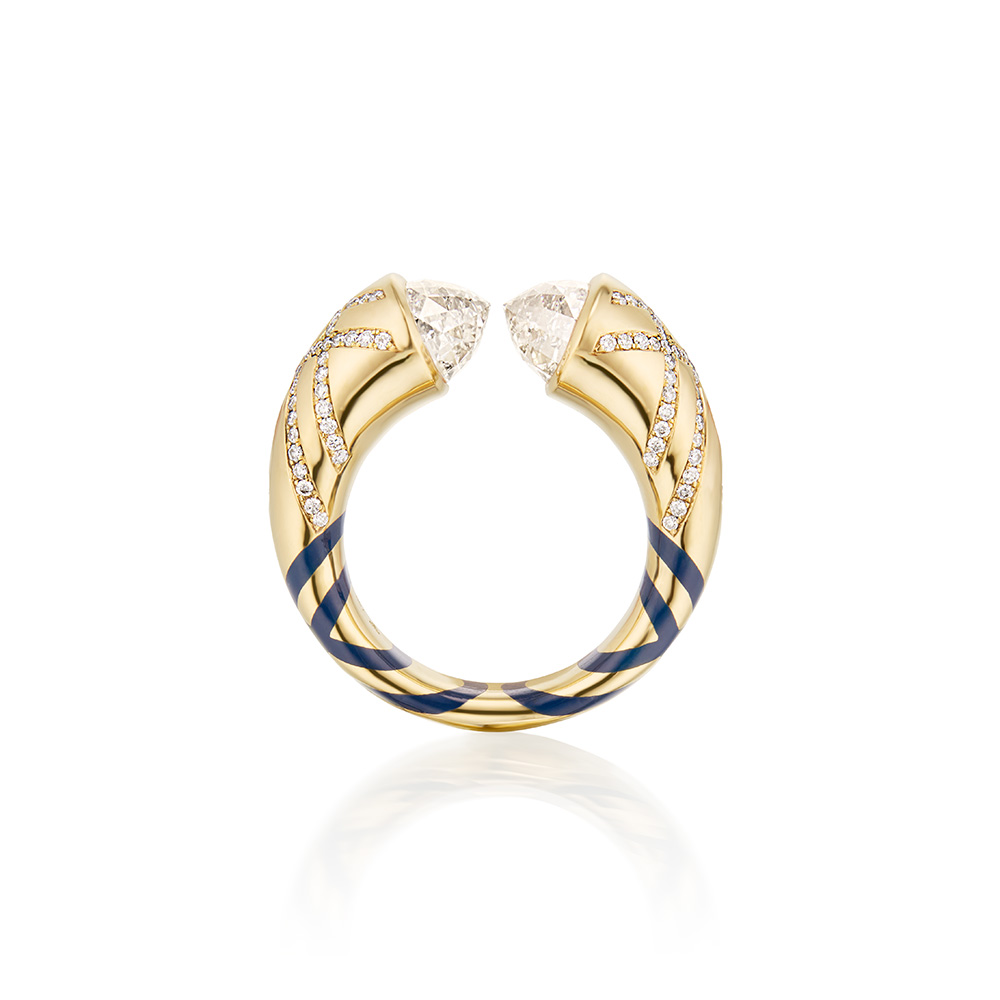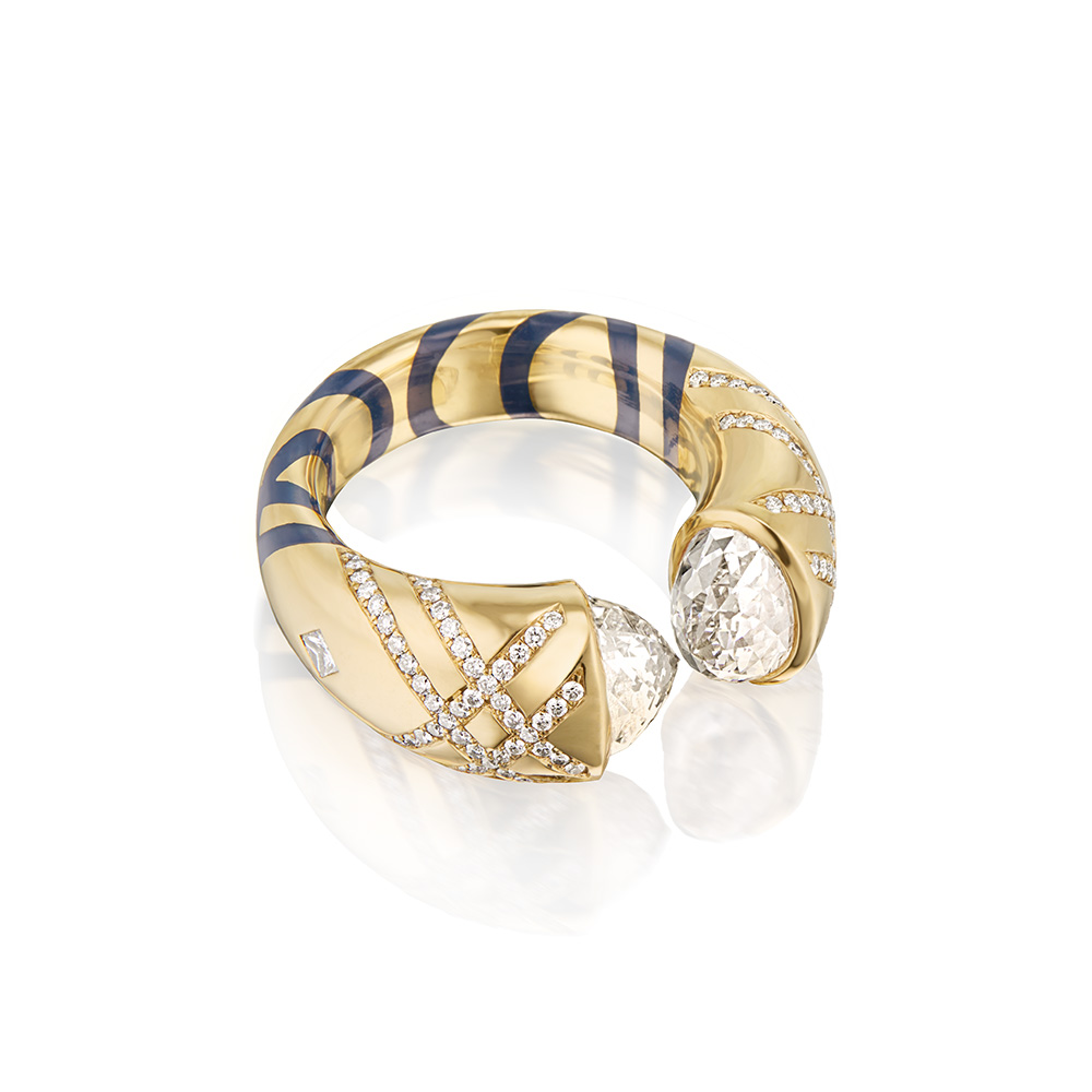 Combining the renitor concept of strength with Sardwell’s desire to entice transformation, many of the one-of-a-kind pieces contain secreted details, such as fluorescent stone patterns that glow alive under a black light. Within others, reinterpreted floral patterns originally found in Japanese indigo fabric prints line the underside creating a playfully feminine and intimate connection between the artist, the jewelry and its wearer. In time, the emotional power and allure illuminates brighter, in the true spirit of renitor.