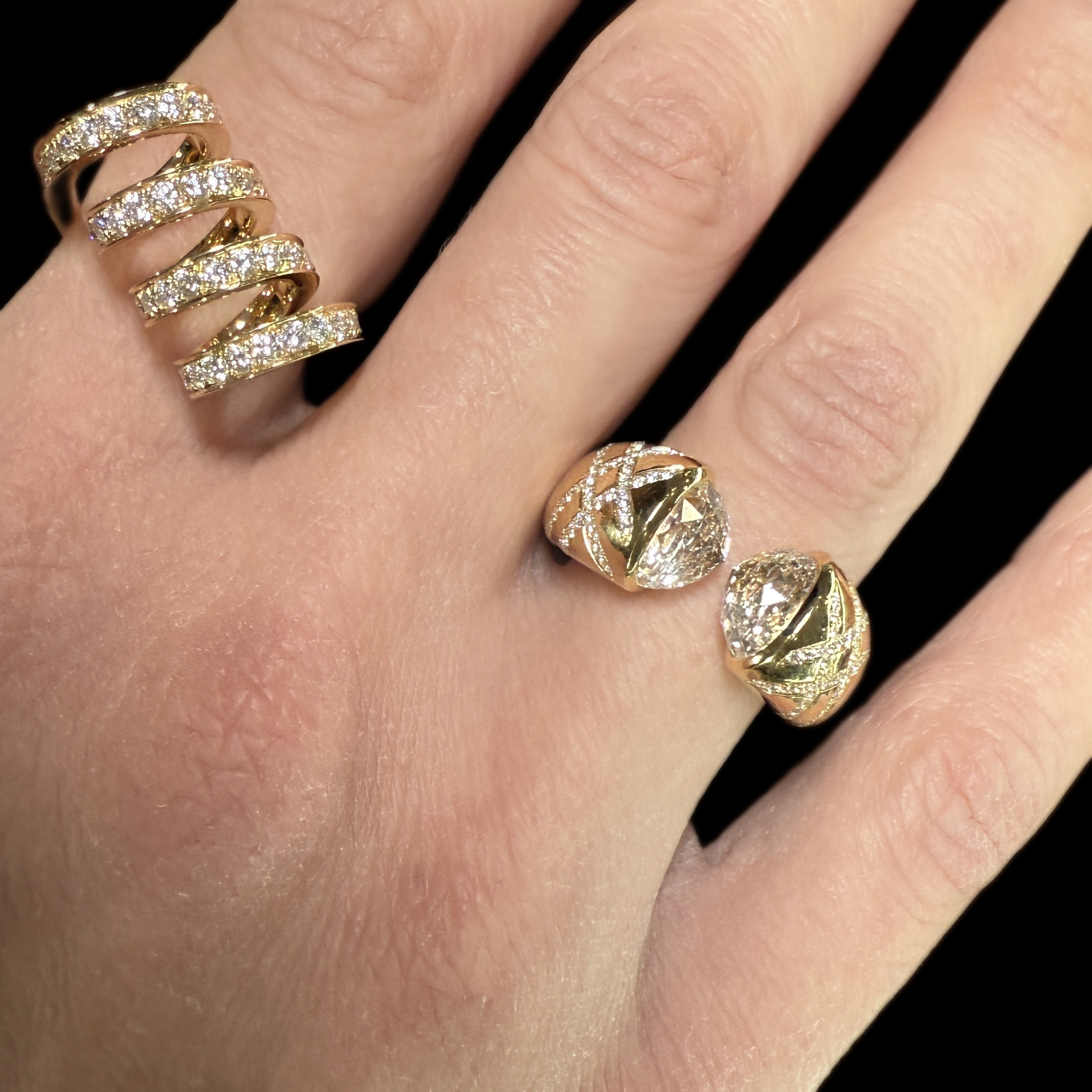 The strong use of black and white conceptually reverberates with the universal concepts of good and evil, shadow and illumination, yin and yang. Black jade, known as a grounding guardian stone, is juxtaposed and sensitively contrasted with icy jade – believed to resolve chaos, restore calm and entice good fortune.